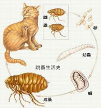 生活史: 跳 蚤吸血後通常可產4-8個卵,卵橢圓形色白或淡黃,蟲卵孵化成幼蟲經過生長化蛹,在適宜的條件下約經過5天後,成蟲即可破蛹而出,幼蟲呈蛆狀,有咀嚼式口 器,自由生活,形成破蛹前成蟲,或破蛹後叮咬人類以維持生命。成蟲破蛹後棲息在地毯或是外界草地上,遇到適當的宿主經過,就會到其身體上寄生,並且在幾秒 鐘類開始吸血、交配。大部分雌蚤會在34小時內完成第一次交配。當成蟲吸食一頓後,成蚤就條離犬貓的身體,將卵產在地毯上、地板縫等地方。一對成蚤任其繁 殖,在3個月時間內,可以產生20000個後代,蟲卵孵化成幼蟲大約需要2-12天。 |